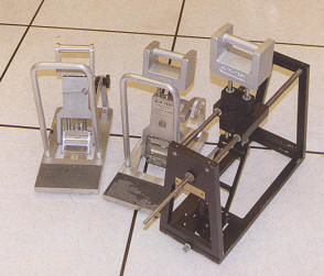 The Family of Brungraber devices all use the same sensor foot design to mimic the James machine. This is a 3" by 3" square of leather or other material. The large pads are likely to hydroplane during wet testing, so modern usage requires a scoring of the pad in a tic-tac-toe pattern. For the first time, here is a family portrait of all three of the Brungraber devices (from left to right) Brungraber Mark III, Mark II, and Mark I.